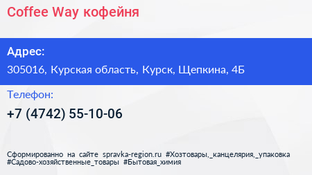 Coffee Way, кофейня по адресу 305016, Курская область, Курск, Щепкина, 4Б в дальнейшем Организация, размещена в следующих категориях: