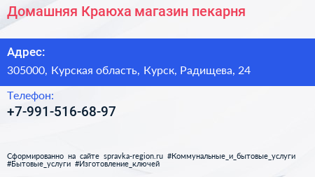 Домашняя Краюха, магазин-пекарня по адресу 305000, Курская область, Курск, Радищева, 24 в дальнейшем Организация, размещена в следующих категориях: