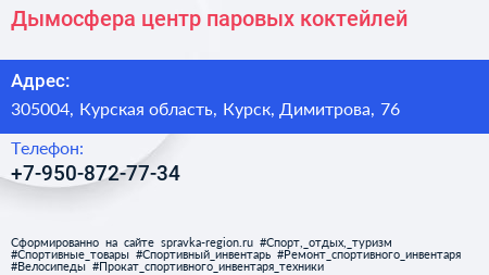 Дымосфера, центр паровых коктейлей по адресу 305004, Курская область, Курск, Димитрова, 76 в дальнейшем Организация, размещена в следующих категориях: