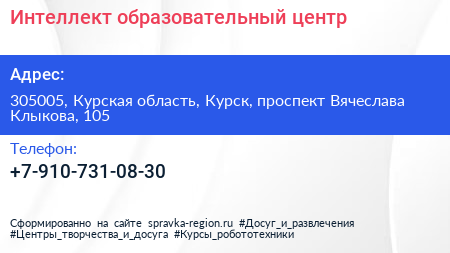 Интеллект, образовательный центр по адресу 305005, Курская область, Курск, проспект Вячеслава Клыкова, 105 в дальнейшем Организация, размещена в следующих категориях: