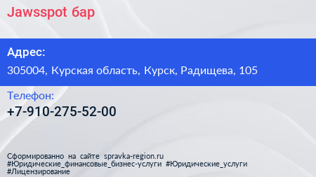 Jawsspot, бар по адресу 305004, Курская область, Курск, Радищева, 105 в дальнейшем Организация, размещена в следующих категориях: