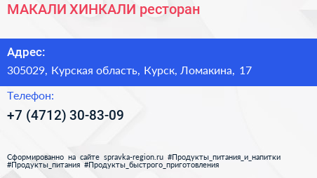 МАКАЛИ ХИНКАЛИ, ресторан по адресу 305029, Курская область, Курск, Ломакина, 17 в дальнейшем Организация, размещена в следующих категориях: