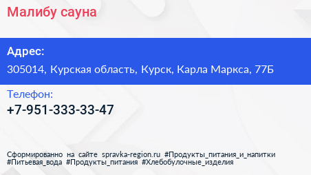 Малибу, сауна по адресу 305014, Курская область, Курск, Карла Маркса, 77Б в дальнейшем Организация, размещена в следующих категориях: