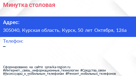 Минутка, столовая по адресу 305040, Курская область, Курск, 50 лет Октября, 126а в дальнейшем Организация, размещена в следующих категориях: