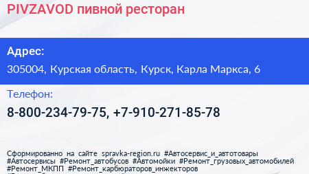 PIVZAVOD, пивной ресторан по адресу 305004, Курская область, Курск, Карла Маркса, 6 в дальнейшем Организация, размещена в следующих категориях: