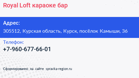 Royal Loft, караоке-бар по адресу 305512, Курская область, Курск, посёлок Камыши, 36 в дальнейшем Организация, размещена в следующих категориях: