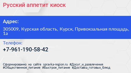 Русский аппетит, киоск по адресу 305009, Курская область, Курск, Привокзальная площадь, 1а в дальнейшем Организация, размещена в следующих категориях:
