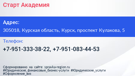 Старт Академия по адресу 305018, Курская область, Курск, проспект Кулакова, 5 в дальнейшем Организация, размещена в следующих категориях: