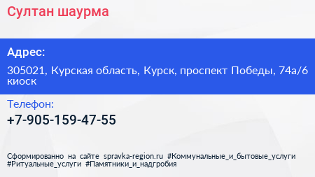 Султан шаурма по адресу 305021, Курская область, Курск, проспект Победы, 74а/6 киоск в дальнейшем Организация, размещена в следующих категориях:
