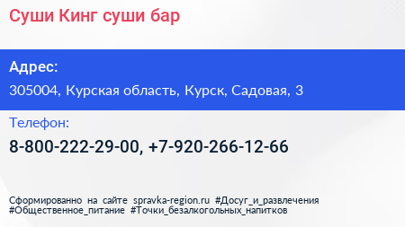 Суши Кинг, суши-бар по адресу 305004, Курская область, Курск, Садовая, 3 в дальнейшем Организация, размещена в следующих категориях: