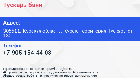 Тускарь, баня по адресу 305511, Курская область, Курск, территория Тускарь ст, 130 в дальнейшем Организация, размещена в следующих категориях: