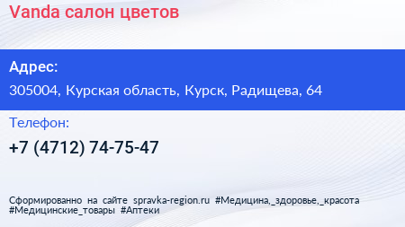 Vanda, салон цветов по адресу 305004, Курская область, Курск, Радищева, 64 в дальнейшем Организация, размещена в следующих категориях: