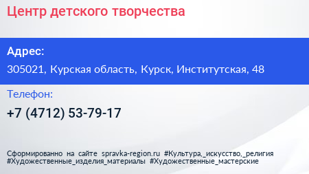 Центр детского творчества по адресу 305021, Курская область, Курск, Институтская, 48 в дальнейшем Организация, размещена в следующих категориях: