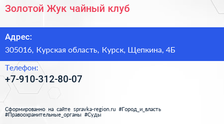 Золотой Жук, чайный клуб по адресу 305016, Курская область, Курск, Щепкина, 4Б в дальнейшем Организация, размещена в следующих категориях: