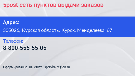 5post, сеть пунктов выдачи заказов по адресу 305026, Курская область, Курск, Менделеева, 67 в дальнейшем Организация, размещена в следующих категориях: