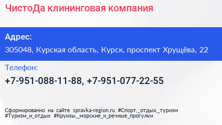ЧистоДа, клининговая компания по адресу 305048, Курская область, Курск, проспект Хрущёва, 22 в дальнейшем Организация, размещена в следующих категориях:
