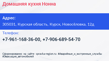 Домашняя кухня Нонна по адресу 305031, Курская область, Курск, Новосёловка, 12д в дальнейшем Организация, размещена в следующих категориях:
