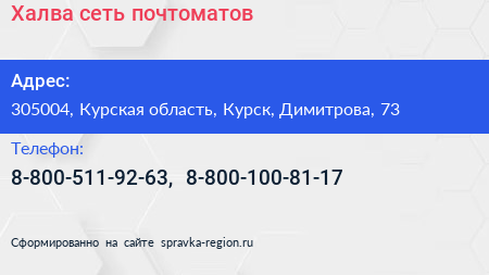 Халва, сеть почтоматов по адресу 305004, Курская область, Курск, Димитрова, 73 в дальнейшем Организация, размещена в следующих категориях: