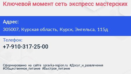 Ключевой момент, сеть экспресс-мастерских по адресу 305007, Курская область, Курск, Энгельса, 115д в дальнейшем Организация, размещена в следующих категориях: