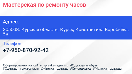 Мастерская по ремонту часов по адресу 305038, Курская область, Курск, Константина Воробьёва, 5а в дальнейшем Организация, размещена в следующих категориях:
