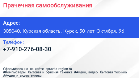 Прачечная самообслуживания по адресу 305040, Курская область, Курск, 50 лет Октября, 96 в дальнейшем Организация, размещена в следующих категориях: