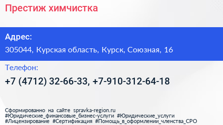 Престиж, химчистка по адресу 305044, Курская область, Курск, Союзная, 16 в дальнейшем Организация, размещена в следующих категориях: