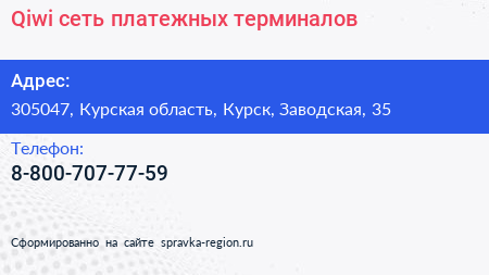 Qiwi, сеть платежных терминалов по адресу 305047, Курская область, Курск, Заводская, 35 в дальнейшем Организация, размещена в следующих категориях: