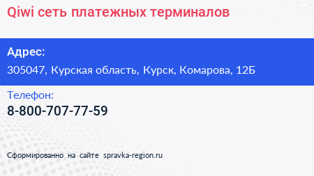 Qiwi, сеть платежных терминалов по адресу 305047, Курская область, Курск, Комарова, 12Б в дальнейшем Организация, размещена в следующих категориях: