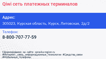 Qiwi, сеть платежных терминалов по адресу 305023, Курская область, Курск, Литовская, 2д/2 в дальнейшем Организация, размещена в следующих категориях: