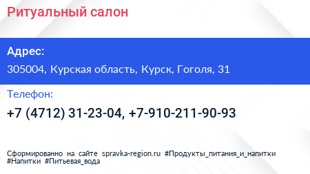 Ритуальный салон по адресу 305004, Курская область, Курск, Гоголя, 31 в дальнейшем Организация, размещена в следующих категориях:
