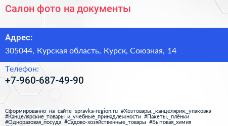 Салон фото на документы по адресу 305044, Курская область, Курск, Союзная, 14 в дальнейшем Организация, размещена в следующих категориях: