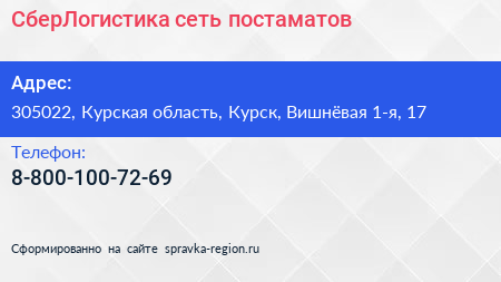 СберЛогистика, сеть постаматов по адресу 305022, Курская область, Курск, Вишнёвая 1-я, 17 в дальнейшем Организация, размещена в следующих категориях: