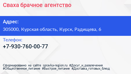 Сваха, брачное агентство по адресу 305000, Курская область, Курск, Радищева, 6 в дальнейшем Организация, размещена в следующих категориях: