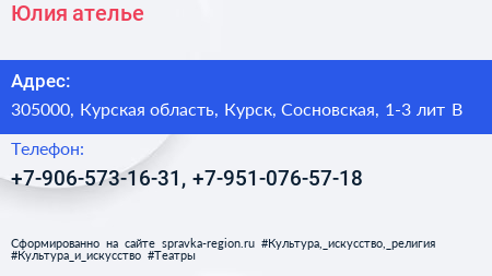 Юлия, ателье по адресу 305000, Курская область, Курск, Сосновская, 1-3 лит В в дальнейшем Организация, размещена в следующих категориях: