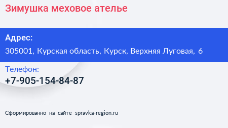 Зимушка, меховое ателье по адресу 305001, Курская область, Курск, Верхняя Луговая, 6 в дальнейшем Организация, размещена в следующих категориях:
