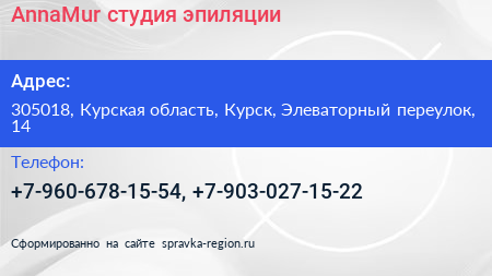 AnnaMur, студия эпиляции по адресу 305018, Курская область, Курск, Элеваторный переулок, 14 в дальнейшем Организация, размещена в следующих категориях: