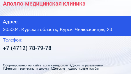 Аполло, медицинская клиника по адресу 305004, Курская область, Курск, Челюскинцев, 23 в дальнейшем Организация, размещена в следующих категориях: