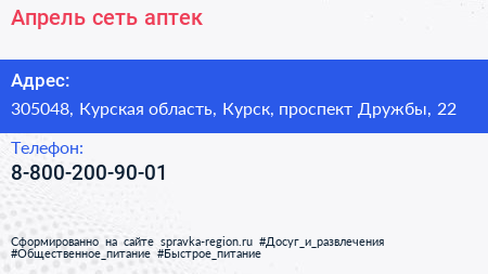 Апрель, сеть аптек по адресу 305048, Курская область, Курск, проспект Дружбы, 22 в дальнейшем Организация, размещена в следующих категориях: