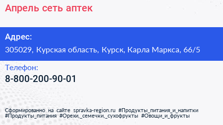 Апрель, сеть аптек по адресу 305029, Курская область, Курск, Карла Маркса, 66/5 в дальнейшем Организация, размещена в следующих категориях: