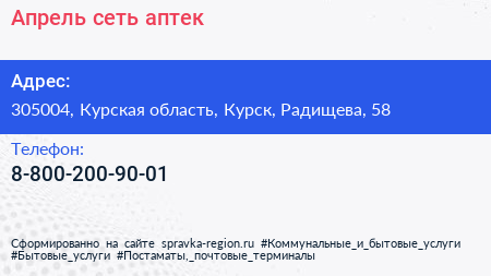 Апрель, сеть аптек по адресу 305004, Курская область, Курск, Радищева, 58 в дальнейшем Организация, размещена в следующих категориях: