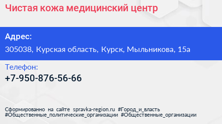 Чистая кожа, медицинский центр по адресу 305038, Курская область, Курск, Мыльникова, 15а в дальнейшем Организация, размещена в следующих категориях: