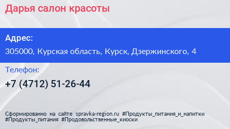 Дарья, салон красоты по адресу 305000, Курская область, Курск, Дзержинского, 4 в дальнейшем Организация, размещена в следующих категориях: