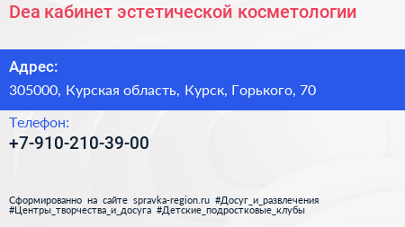 Dea, кабинет эстетической косметологии по адресу 305000, Курская область, Курск, Горького, 70 в дальнейшем Организация, размещена в следующих категориях: