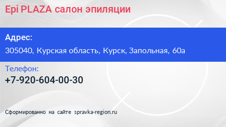 Epi PLAZA, салон эпиляции по адресу 305040, Курская область, Курск, Запольная, 60а в дальнейшем Организация, размещена в следующих категориях: