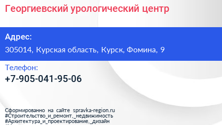 Георгиевский урологический центр по адресу 305014, Курская область, Курск, Фомина, 9 в дальнейшем Организация, размещена в следующих категориях: