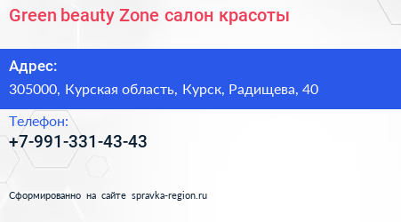Green beauty Zone, салон красоты по адресу 305000, Курская область, Курск, Радищева, 40 в дальнейшем Организация, размещена в следующих категориях: