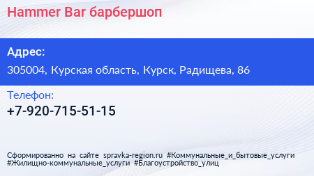 Hammer Bar, барбершоп по адресу 305004, Курская область, Курск, Радищева, 86 в дальнейшем Организация, размещена в следующих категориях: