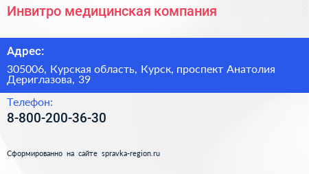 Инвитро, медицинская компания по адресу 305006, Курская область, Курск, проспект Анатолия Дериглазова, 39 в дальнейшем Организация, размещена в следующих категориях: