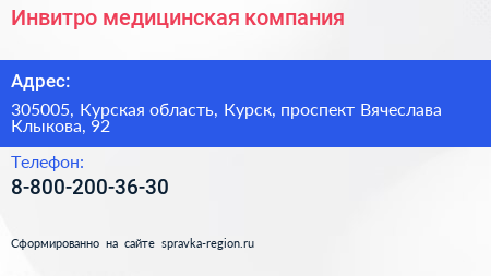 Инвитро, медицинская компания по адресу 305005, Курская область, Курск, проспект Вячеслава Клыкова, 92 в дальнейшем Организация, размещена в следующих категориях: