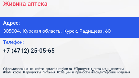 Живика, аптека по адресу 305004, Курская область, Курск, Радищева, 60 в дальнейшем Организация, размещена в следующих категориях: